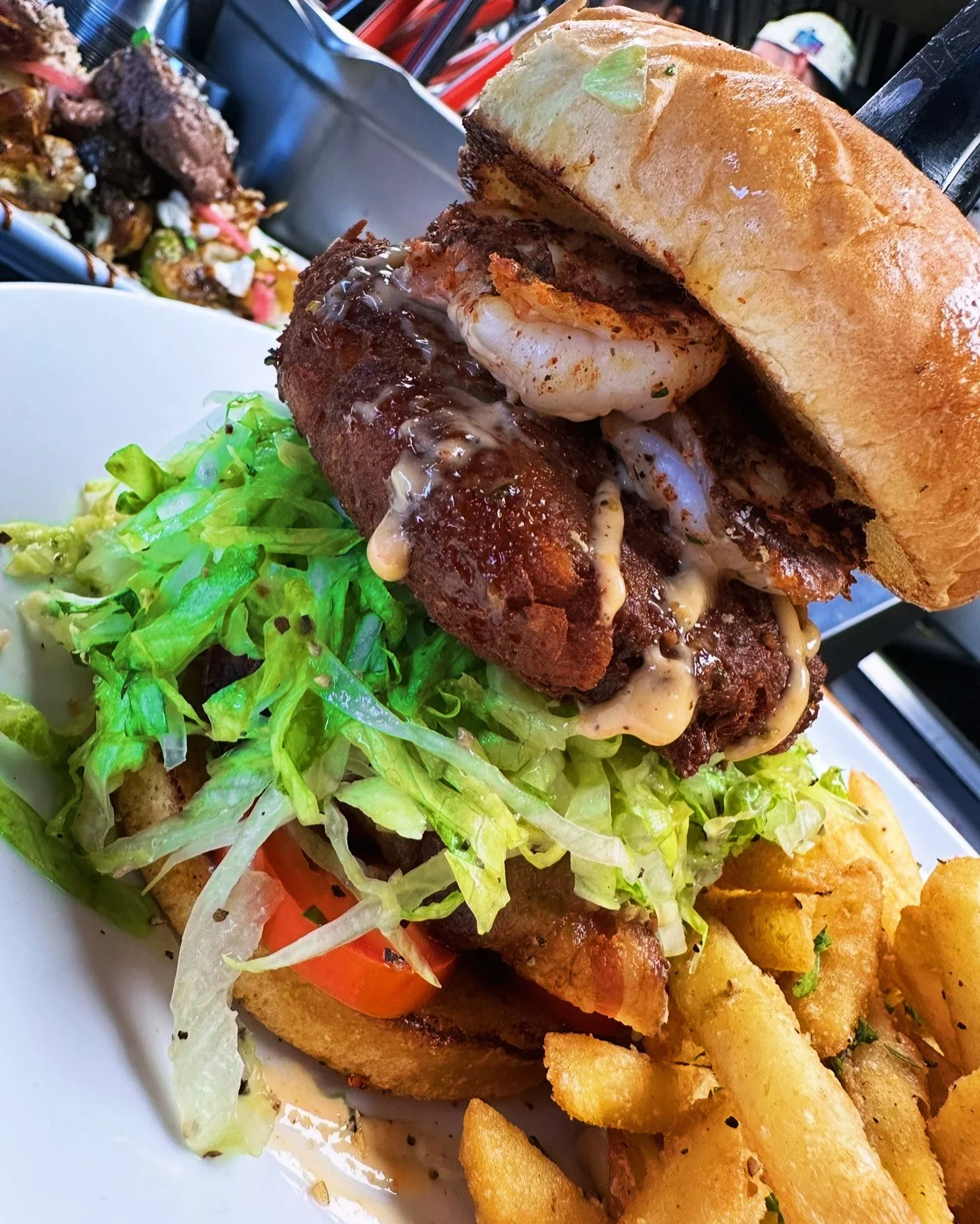 She's baaaack!! From the original menu... the softshell crab BTL. A toasty potato bun with sliced romas, bacon, citrus shredded lettuce, garlic aioli, and a whole fried crab. Served with parm gralic beer battered fries.