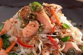 Glazed Honey Garlic Marinated Salmon with Rice Noodles Tossed in Thai Peanut with Veggies.
